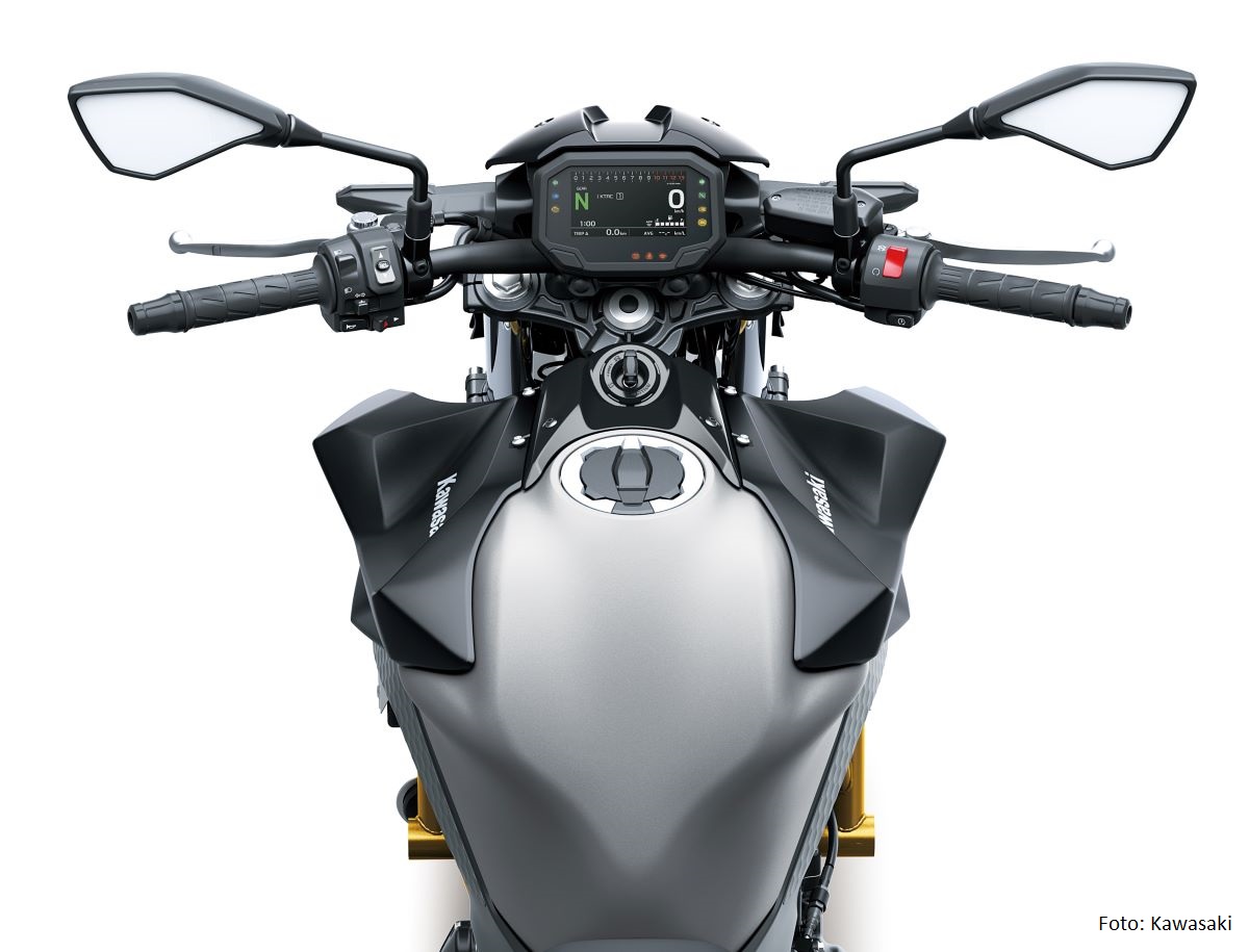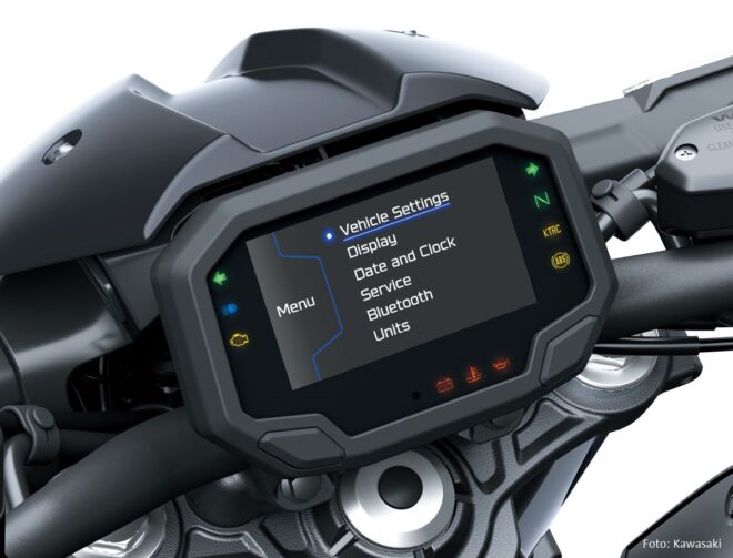 Das Cockpit der Z650 S erhält ein modernes 4,3-Zoll-TFT-Farbdisplay. Es passt sich automatisch an die Lichtverhältnisse an und kann wahlweise mit hellem oder dunklem Hintergrund betrieben werden. Über Bluetooth lässt sich das System mit der Rideology-App verbinden, um Fahrdaten auszulesen oder Einstellungen vorzunehmen.